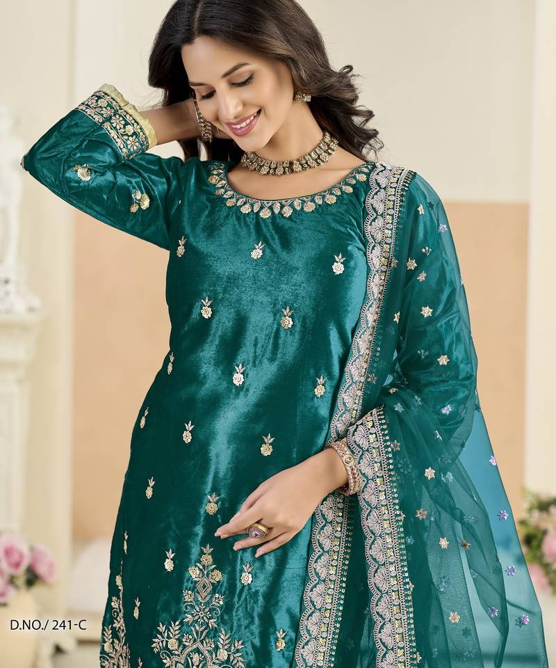 | Product Name | Teal Blue Ice Velvet Semi Stitched Suit With Embroidery Work | |
