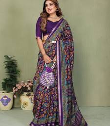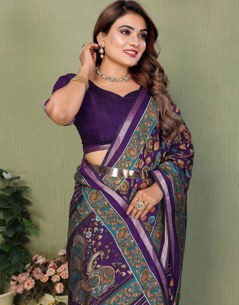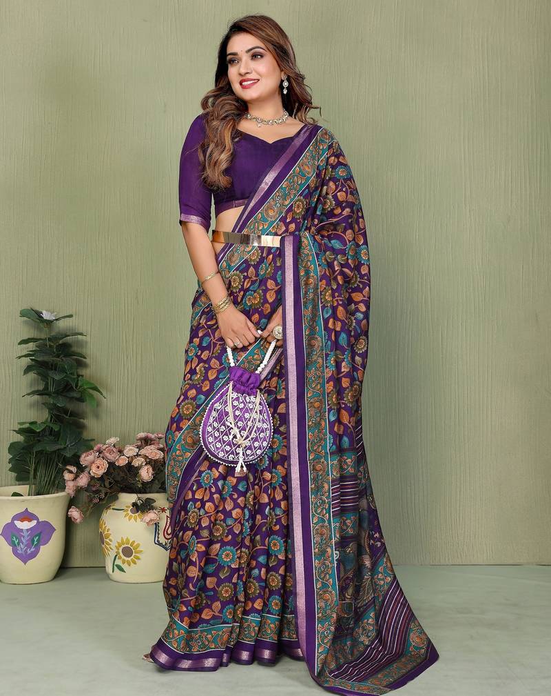 Violate printed mal cotton saree with blouse