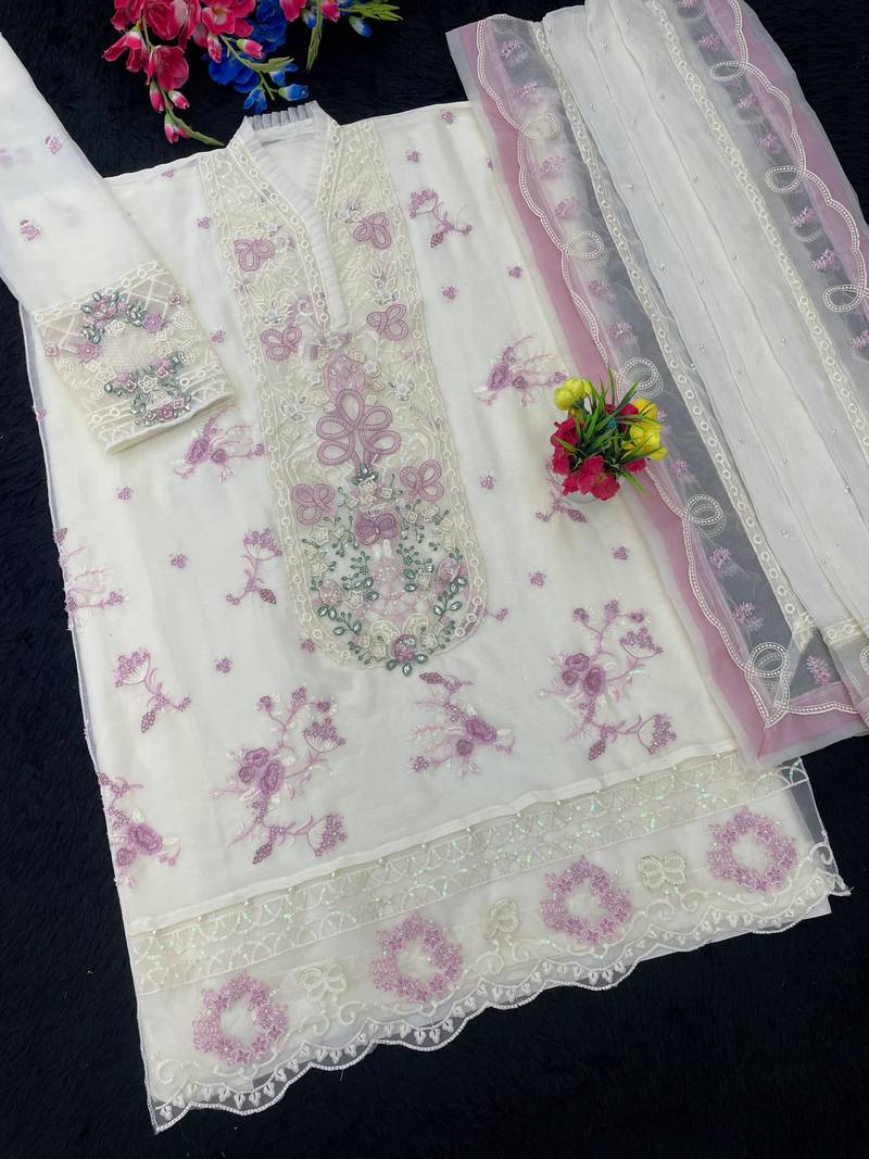 | Product Name | White & Purple Chiffon Suit With Embroidery & Sequin Work | |