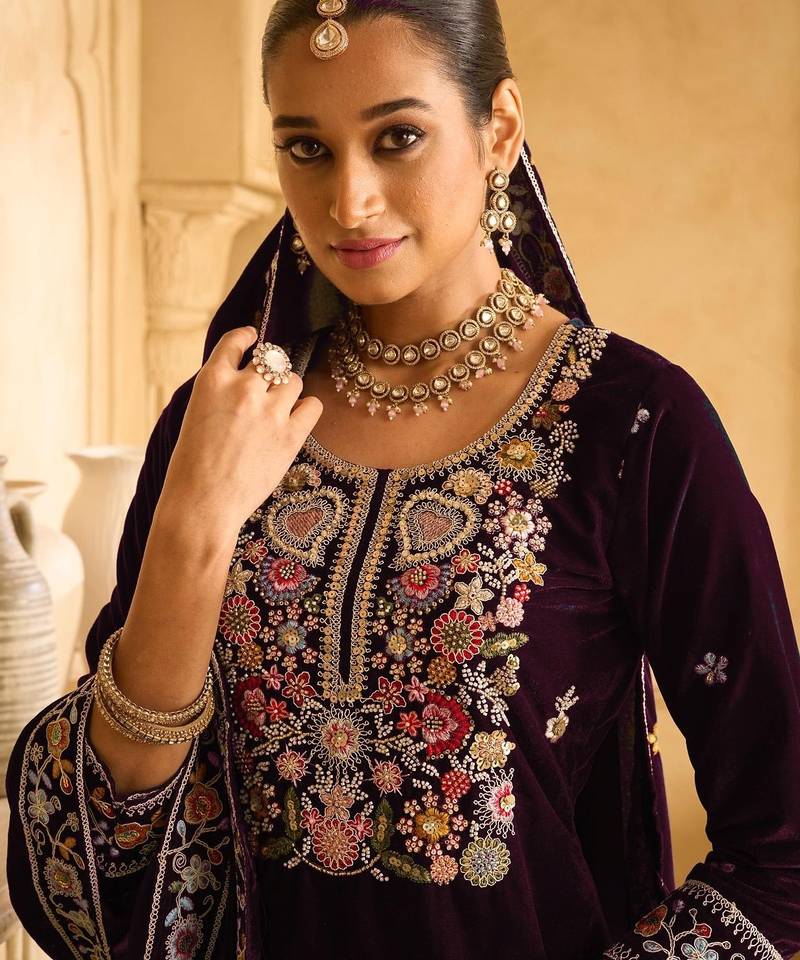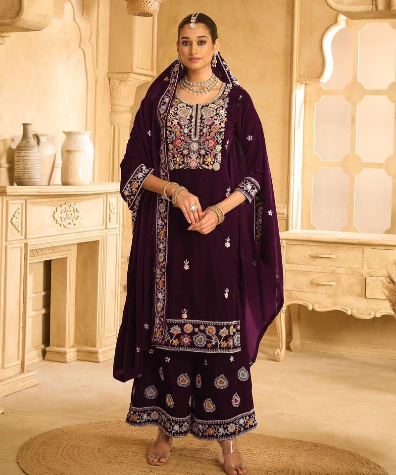 Product Name | Wine Embroderied Velvet Palazzo Suit | |