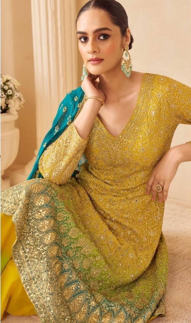 | Product Name | Yellow Real Georgette Free Size Stitched Suit With Sequence & Diamond Work | |