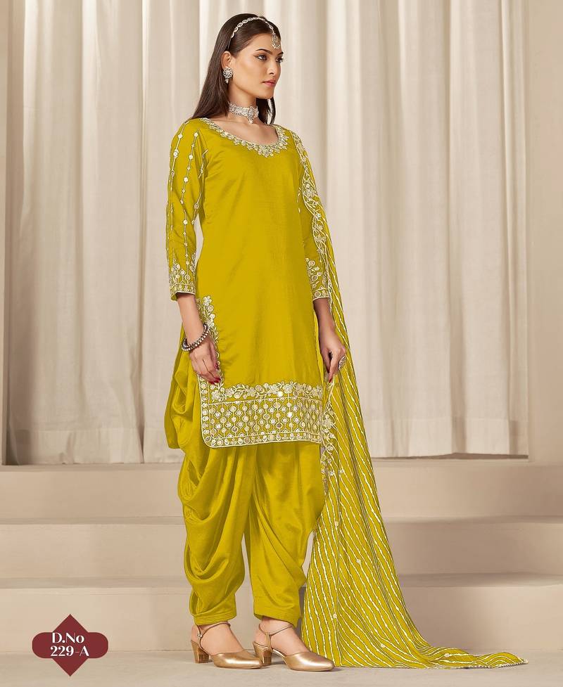 Yellow roman silk semi stitched suit with embroidery & real mirror work