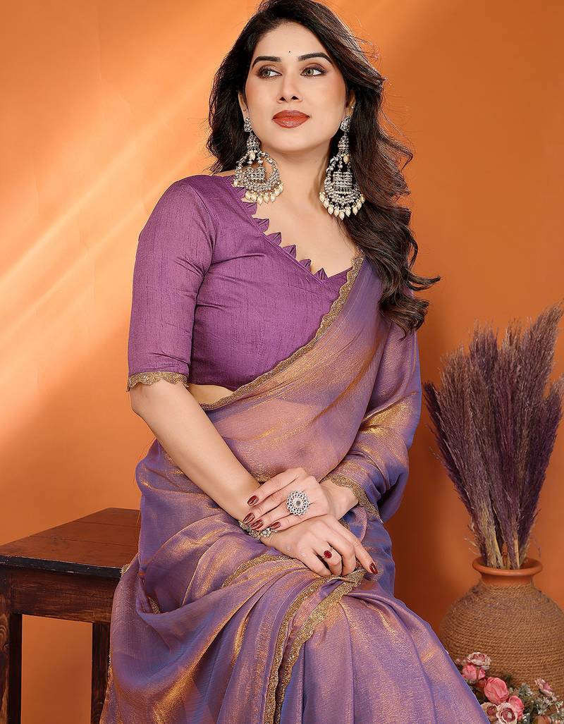 purple elegant embellished chiffon saree with frendi chinese border & blouse piece