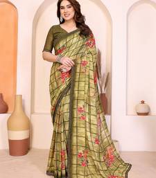 Green floral georgette saree with lace border & blouse piece