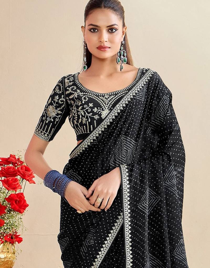 black moss chiffon silk blend bandhani printed saree with embroidered lace boarder with blouse