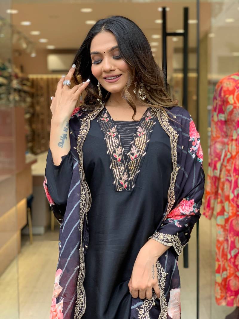 | Product Name | Black Rayon Embroidery Sequin Kurti Pant Dupatta Set | |