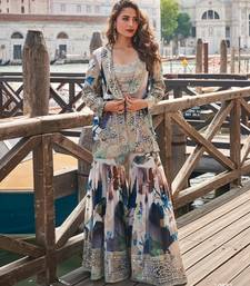 Blue color designer chinon silk printed choli with sequins & mirror work gharara set stitched