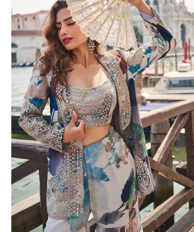| Product Name | Blue Color Designer Chinon Silk Printed Choli With Sequins & Mirror Work Gharara Set | |