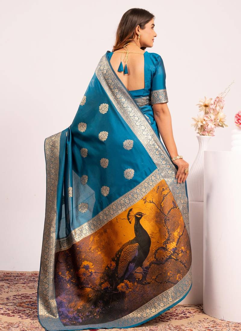 Blue extraordinary banarasi silk saree with resham weave peacock pallu & zari border