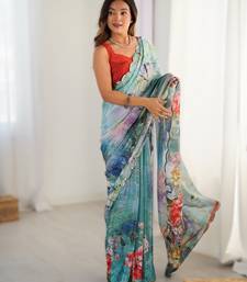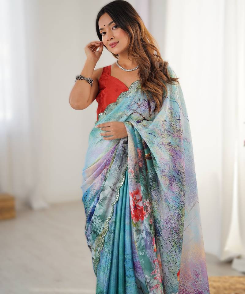 | Product Name | Blue Heavy Chinon Printed Saree With Pape Mirror Work & Mirror Border | Designer Party & Wedding Wear Saree | |