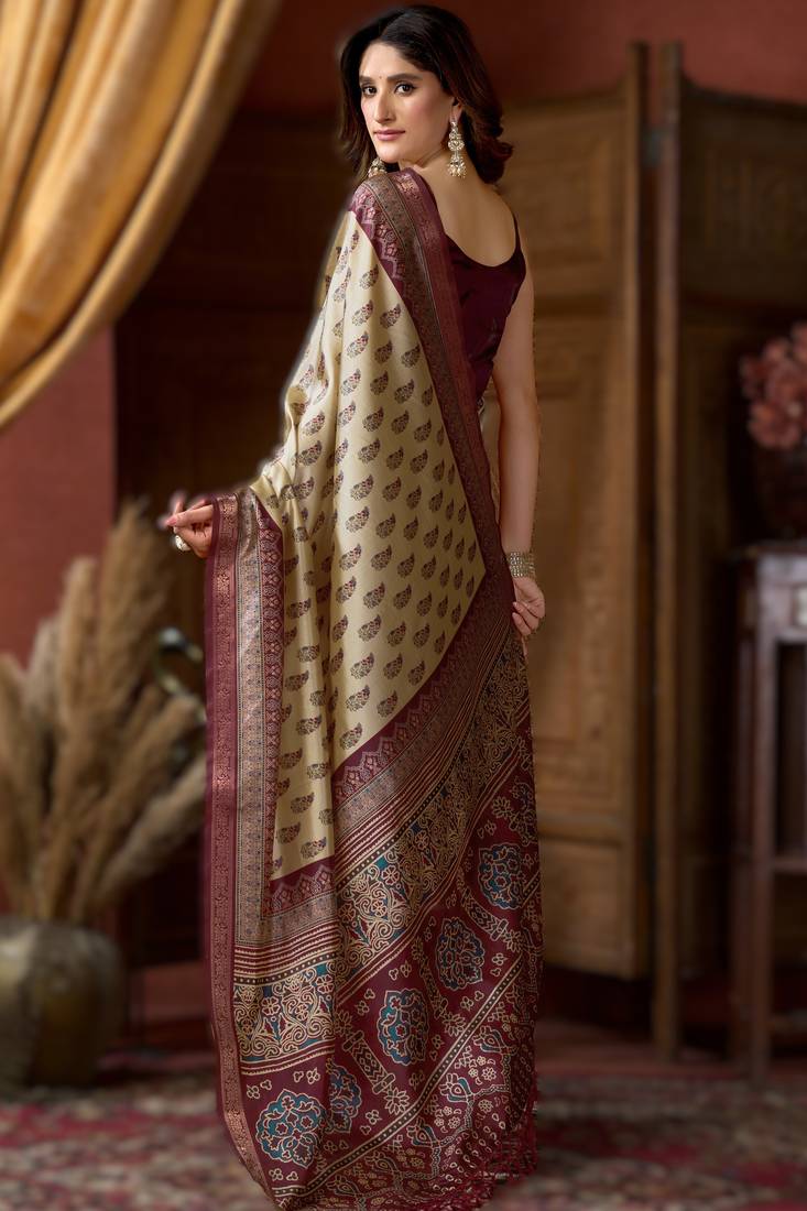 | Product Name | Cream Cluster Digital Saree With Jacquard Border & Jhallar | |