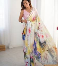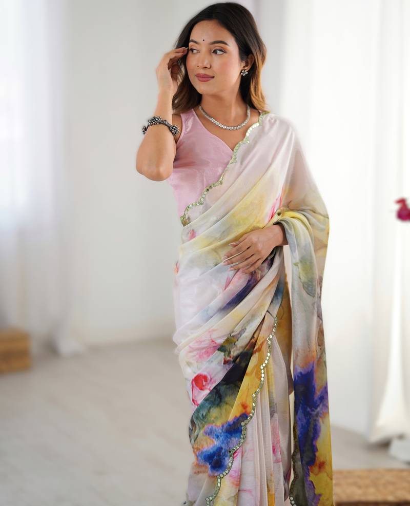 Cream heavy chinon printed saree with pape mirror work & mirror border | designer party & wedding wear saree