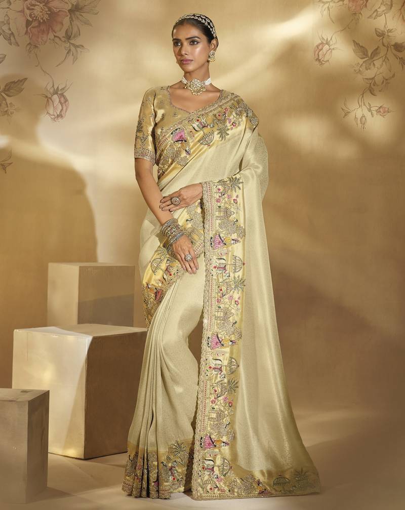 Cream ziraf silk blend saree with jari, thread, cut-dana & moti heavy work