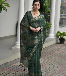 Dark green premium jute linen silk saree with zari weaved pallu, double shaded border