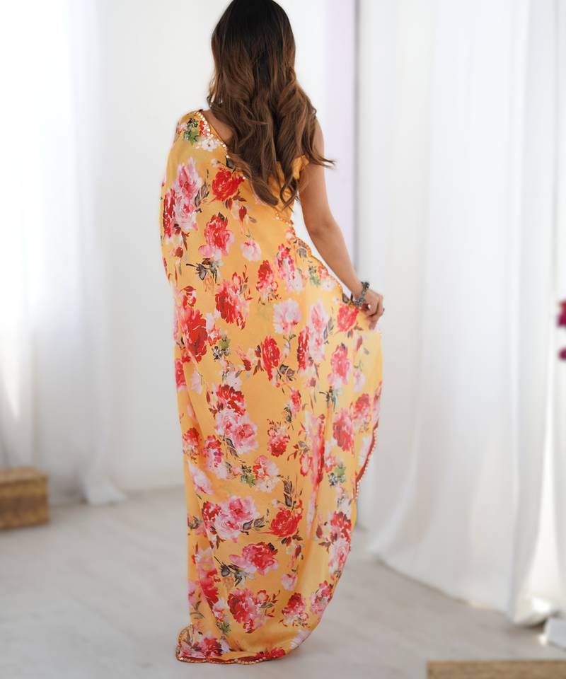 | Product Name | Dark Yellow Heavy Chinon Printed Saree With Pape Mirror Work & Mirror Border | Designer Party & Wedding Wear Saree | |
