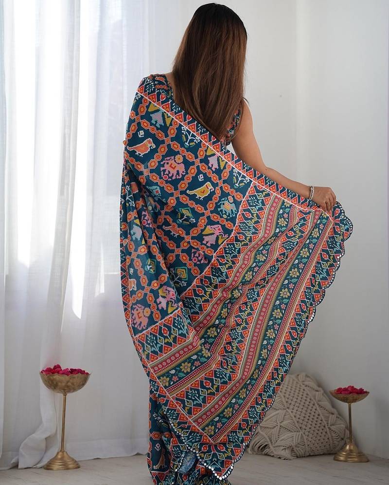 Designer georgette art silk saree with mirror work border & multi-tone print | party wear & festive saree for women