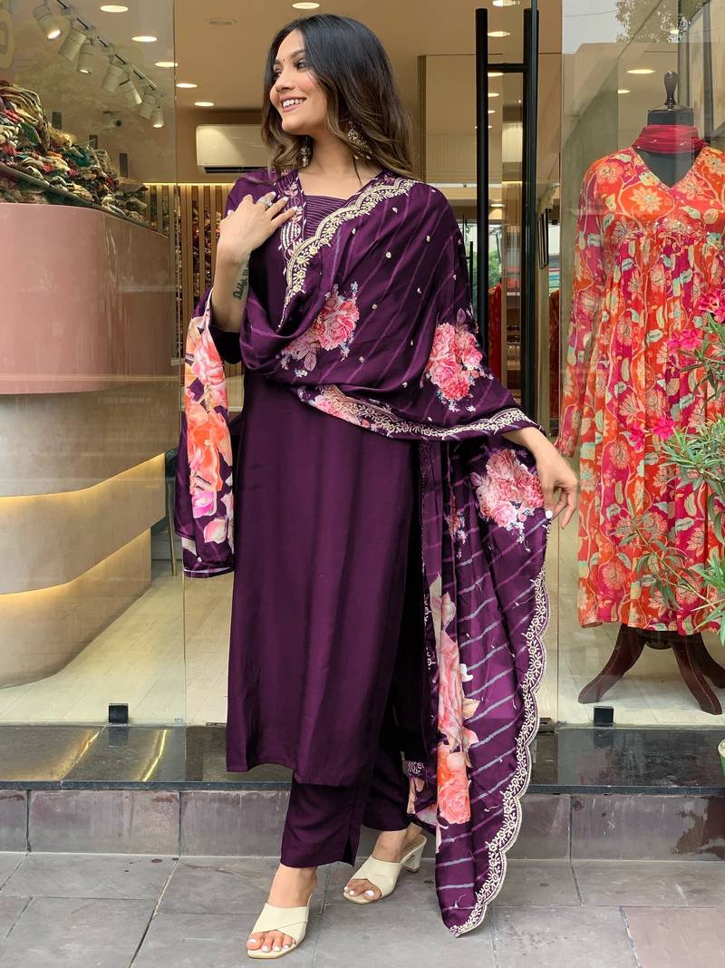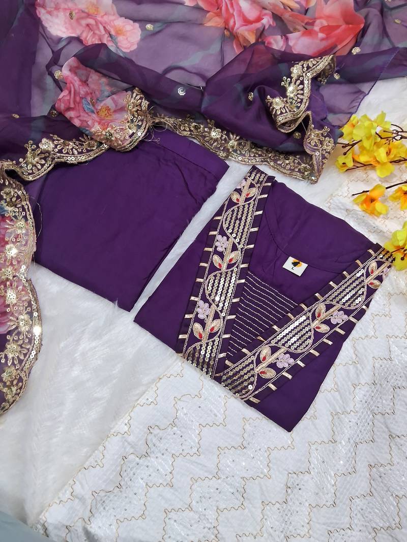 | Product Name | Purple Rayon Embroidery Sequin Kurti Pant Dupatta Set Stitched | |