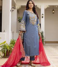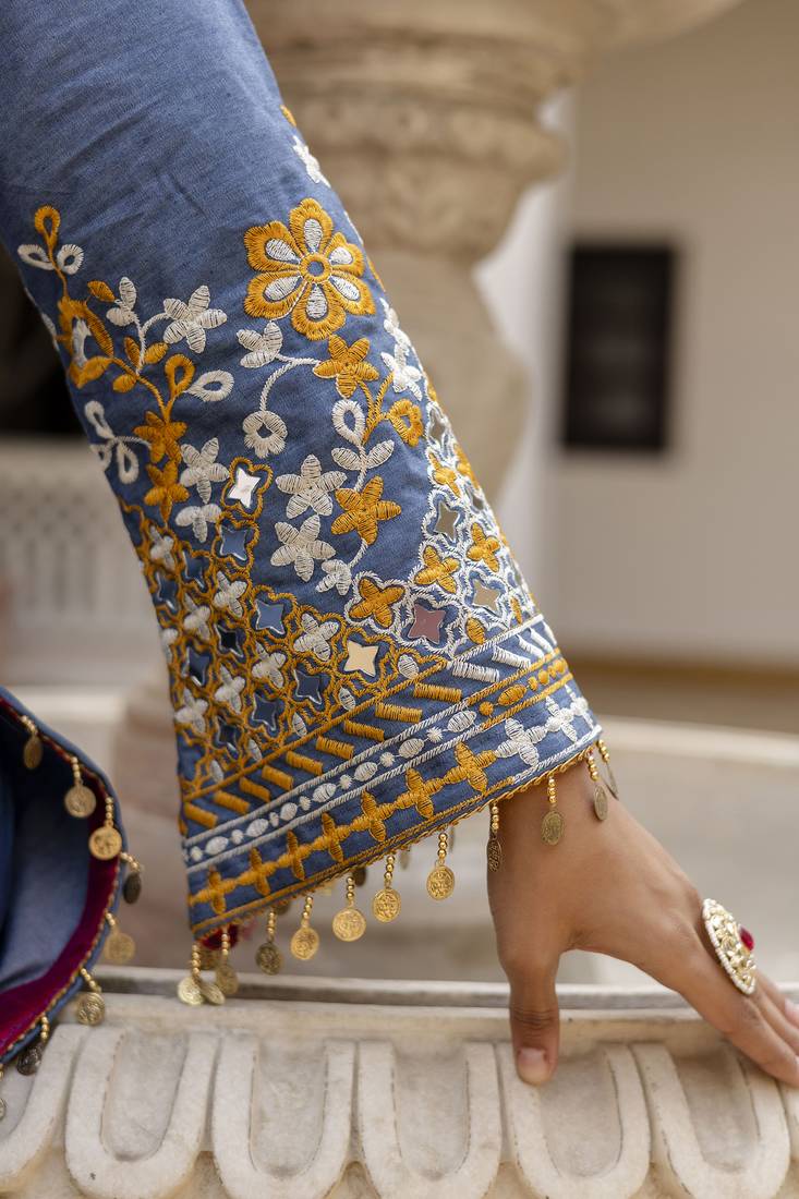 Product Name Embroidered Denim Cotton Kurti Pant Set With Georgette Dupatta – Mirror Work Summer Collection