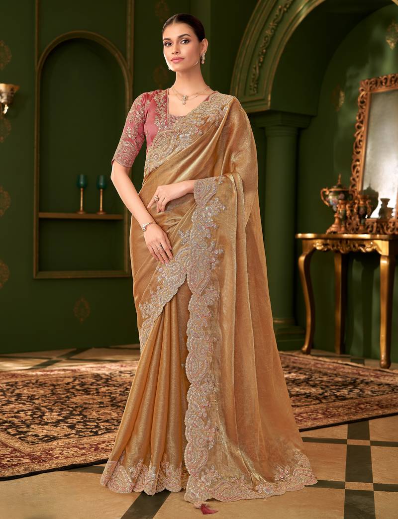 | Product Description | This Gold Satin Chiffon Silk Saree Radiates Glamour And Style. Its Luxurious Fabric, Paired With A Tussar Silk Blouse, Makes It A Must Have For Weddings Or Festive Occasions. The Golden Hue Enhances Your Radiance, Offering A Royal And Graceful Appearance. |