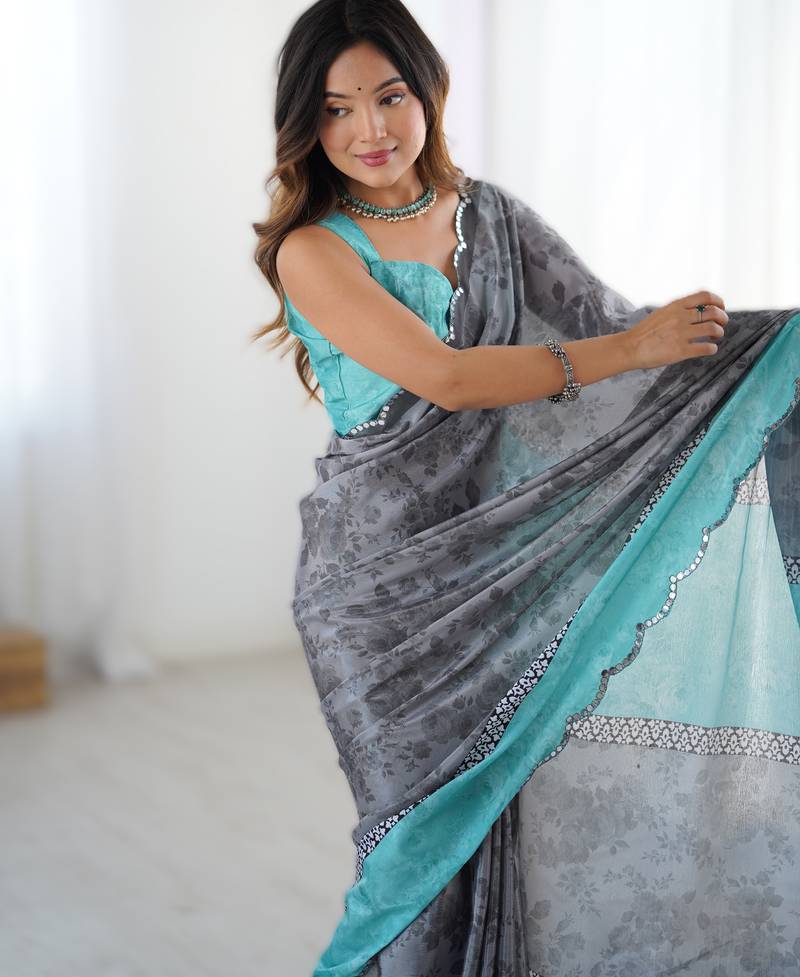 | Product Name | Grey Heavy Chinon Printed Saree With Pape Mirror Work & Mirror Border | Designer Party & Wedding Wear Saree | |