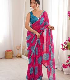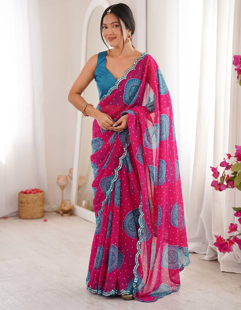 Heavy georgette bandhani gola print saree with mirror work & cutwork border