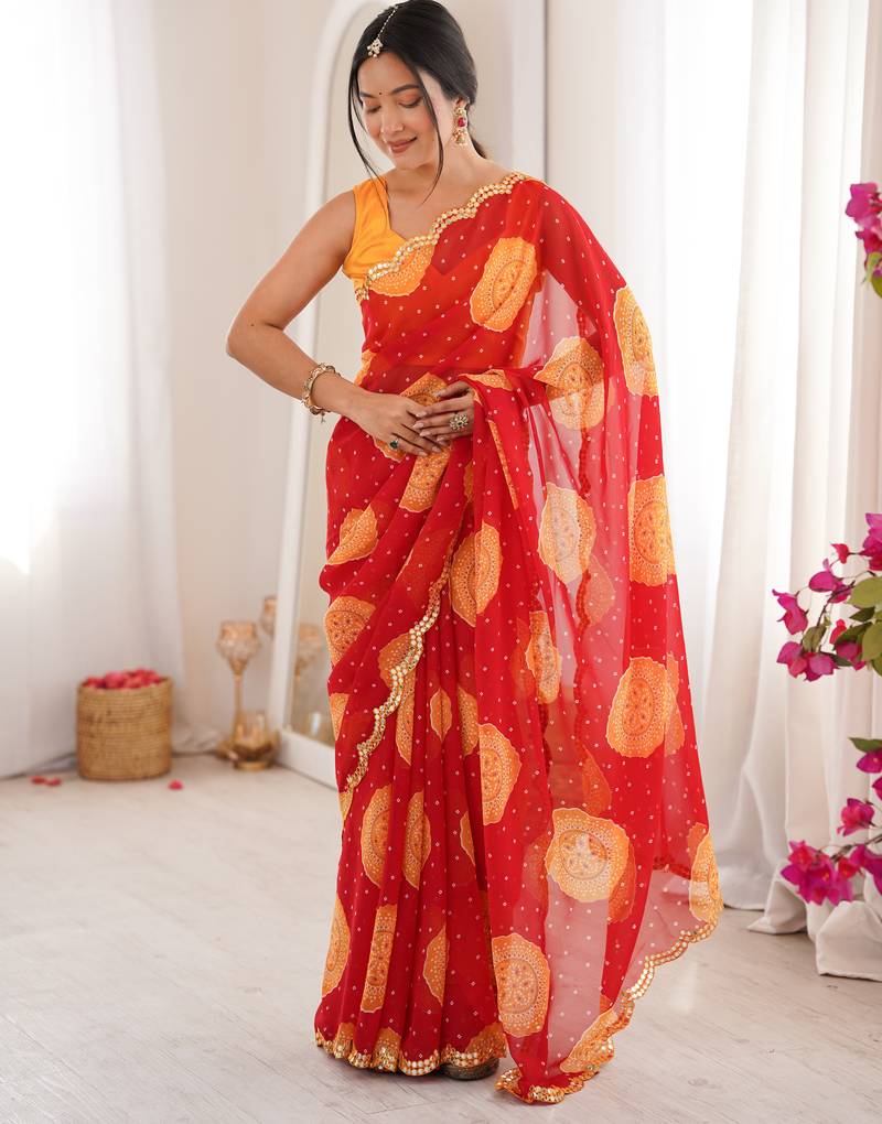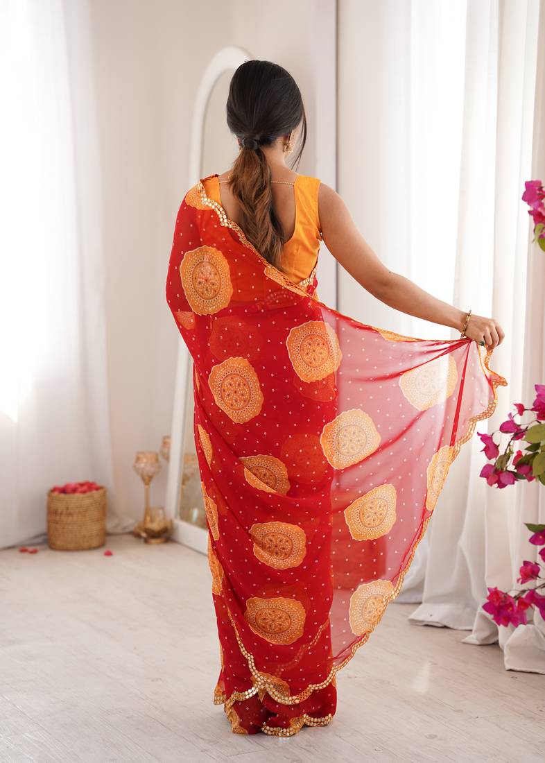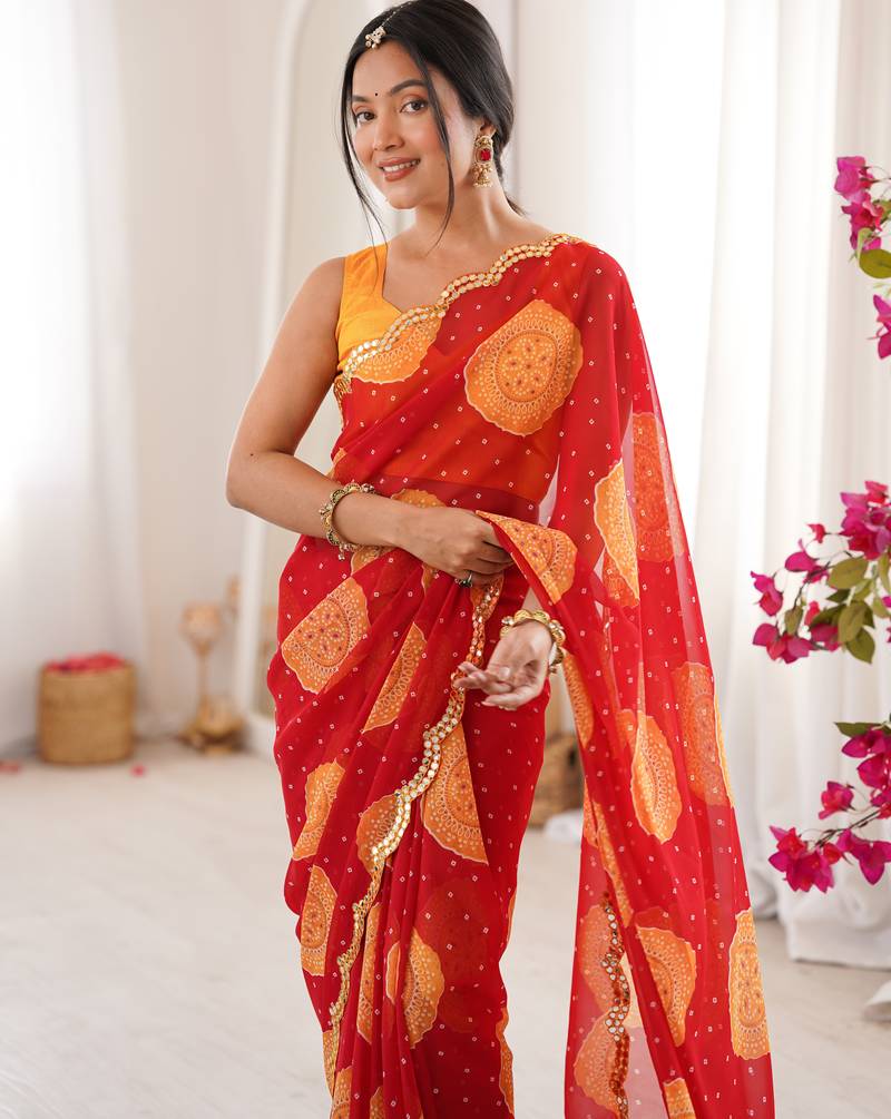 Heavy georgette bandhani gola print saree with mirror work & cutwork border