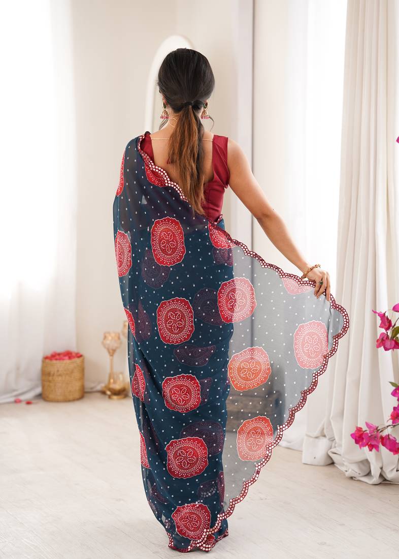 Heavy georgette bandhani gola print saree with mirror work & cutwork border