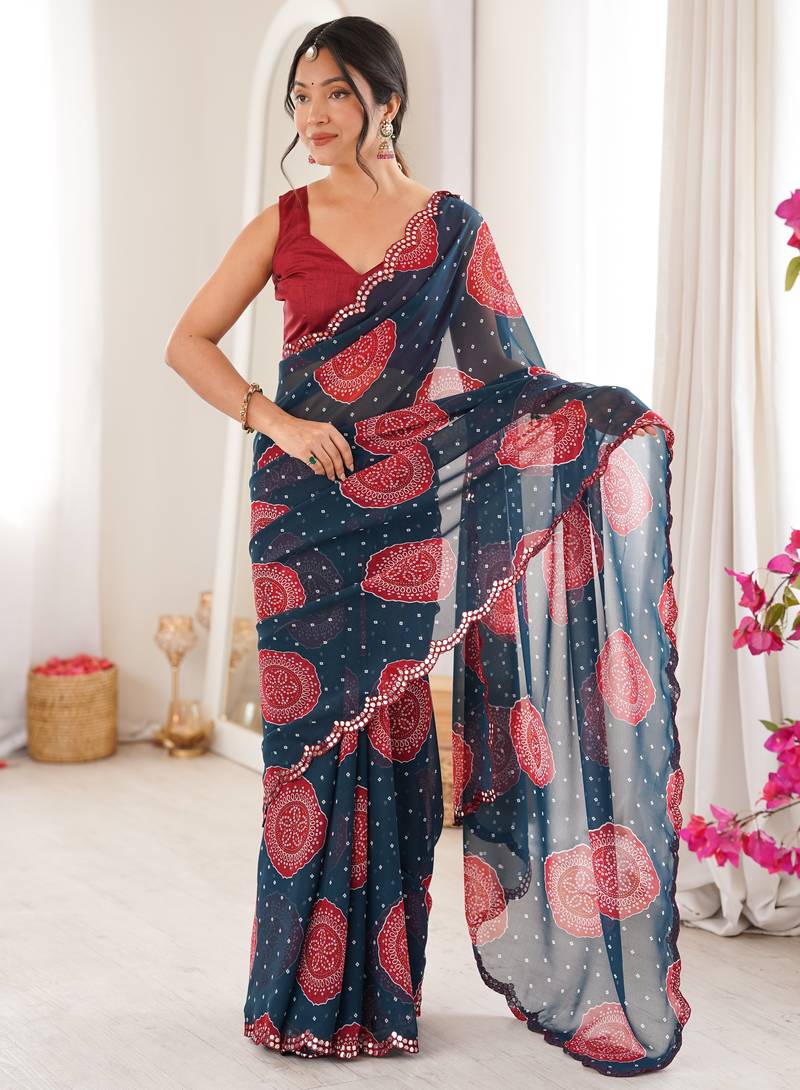 | Product Name | Heavy Georgette Bandhani Gola Print Saree With Mirror Work & Cutwork Border | |