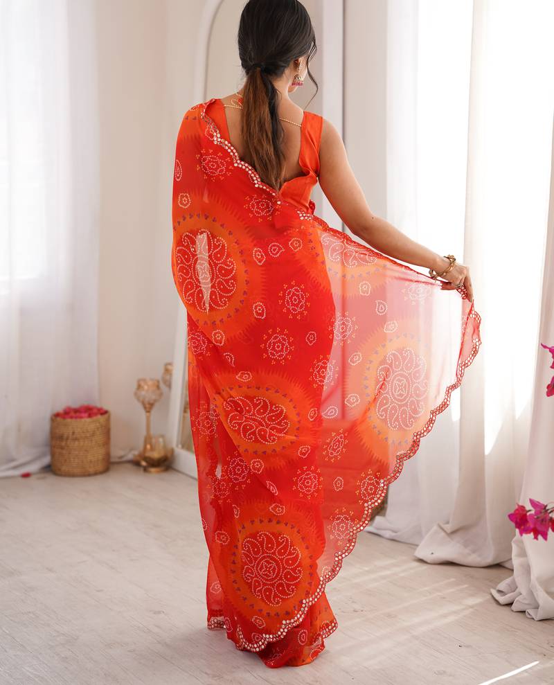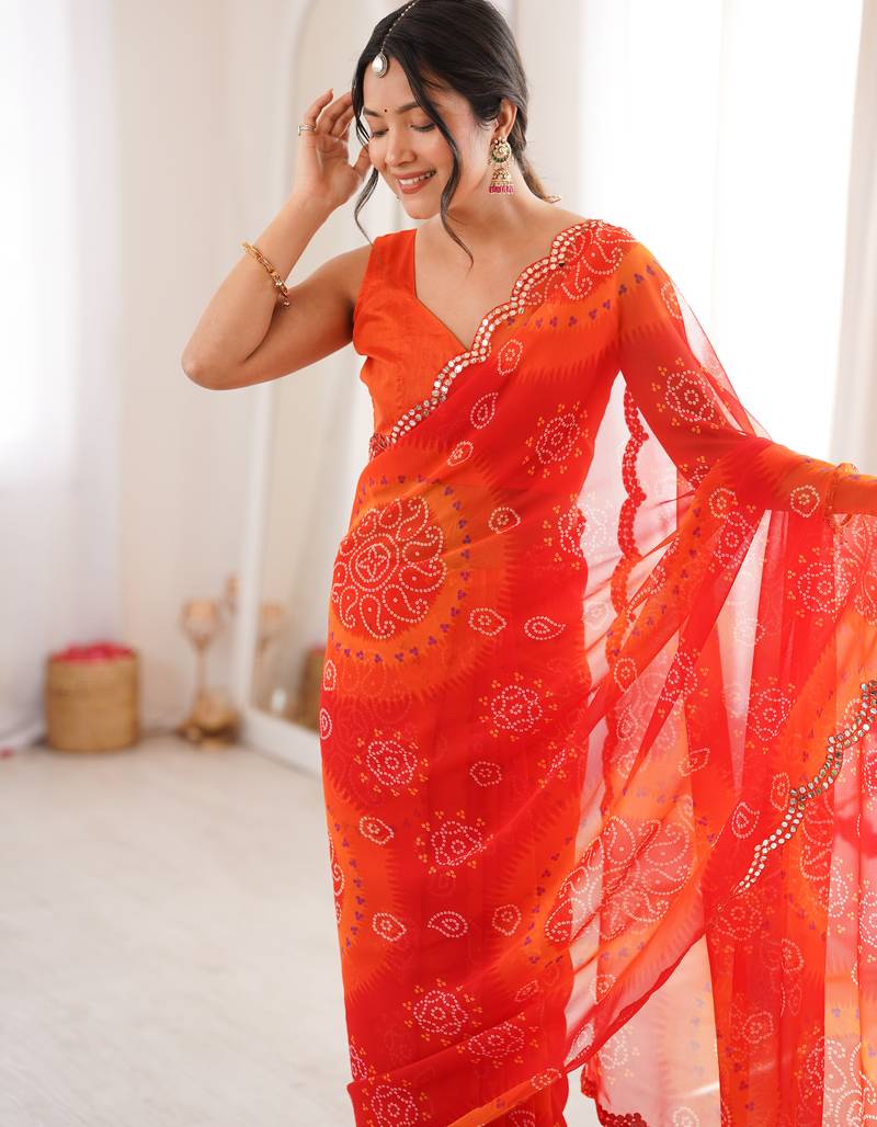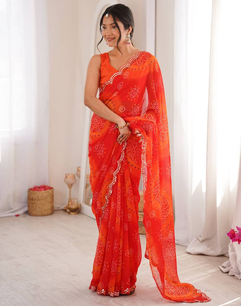 Heavy georgette bandhani keri print saree with mirror work & cutwork border