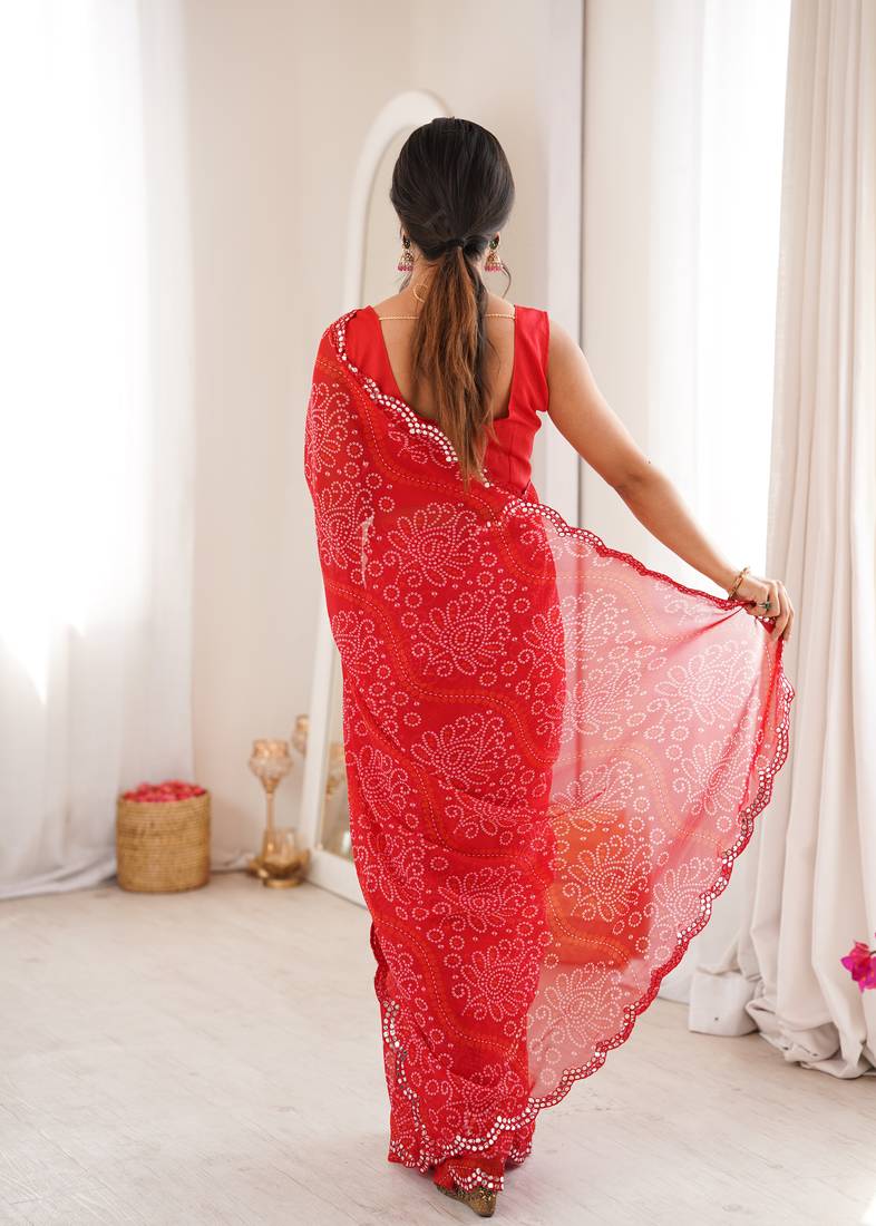 Heavy georgette bandhani print saree with mirror work & cutwork border