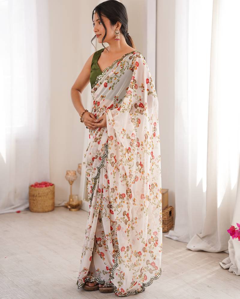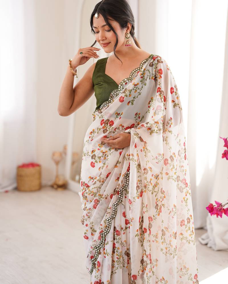 | Product Name | Heavy Georgette Floral Mini Flower Print Saree With Mirror Work & Cutwork Border | |