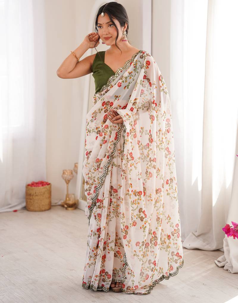 Heavy georgette floral mini flower print saree with mirror work & cutwork border