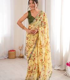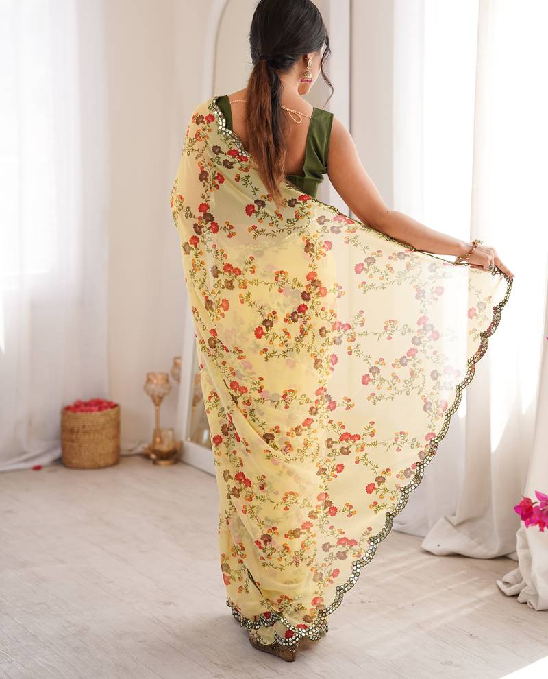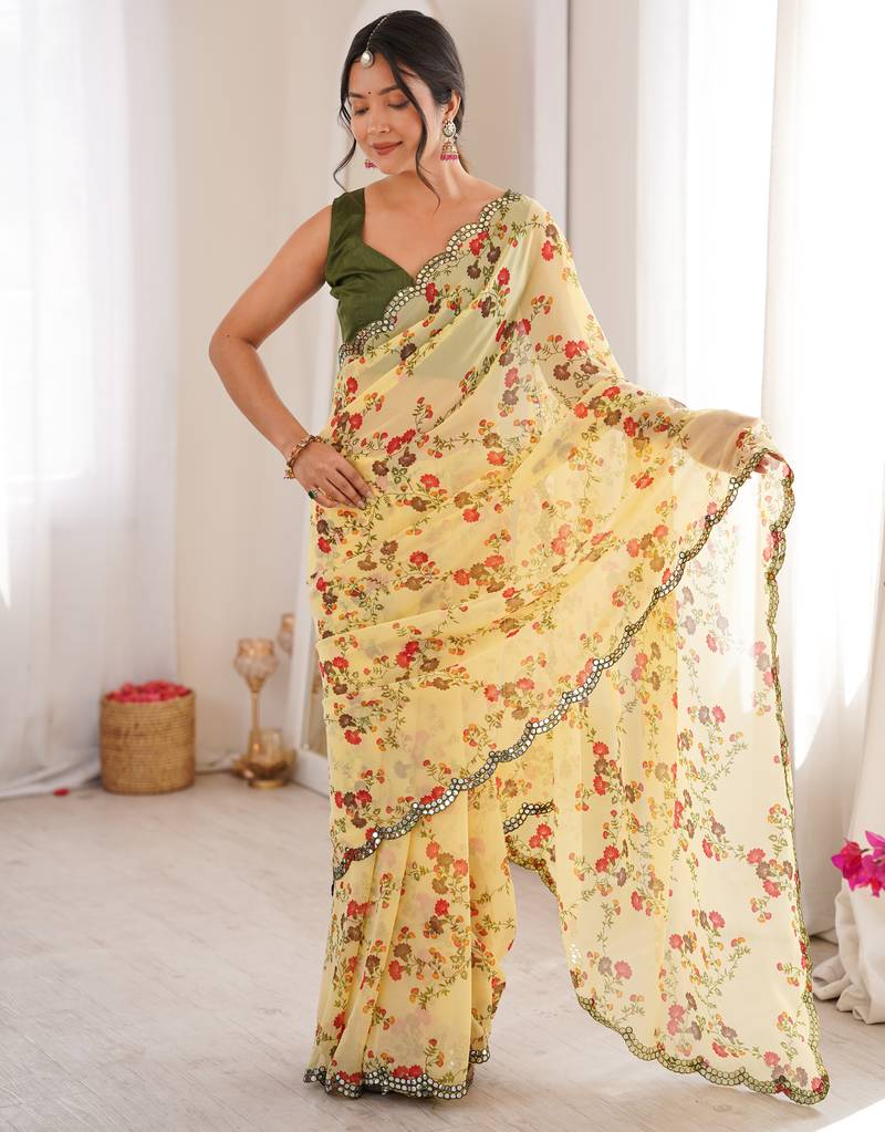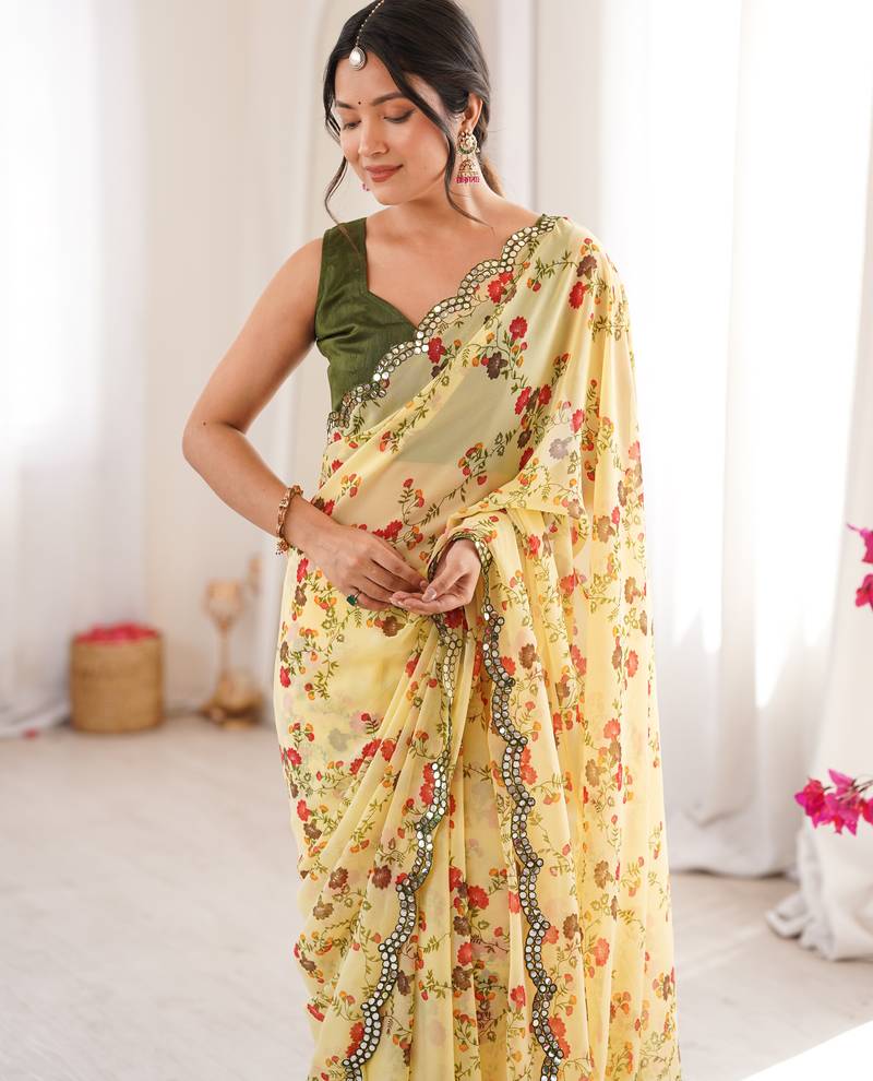 | Product Name | Heavy Georgette Floral Mini Flower Print Saree With Mirror Work & Cutwork Border | |