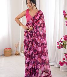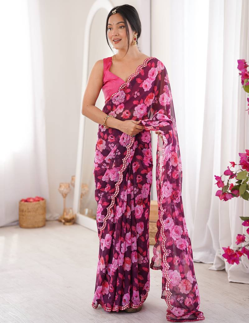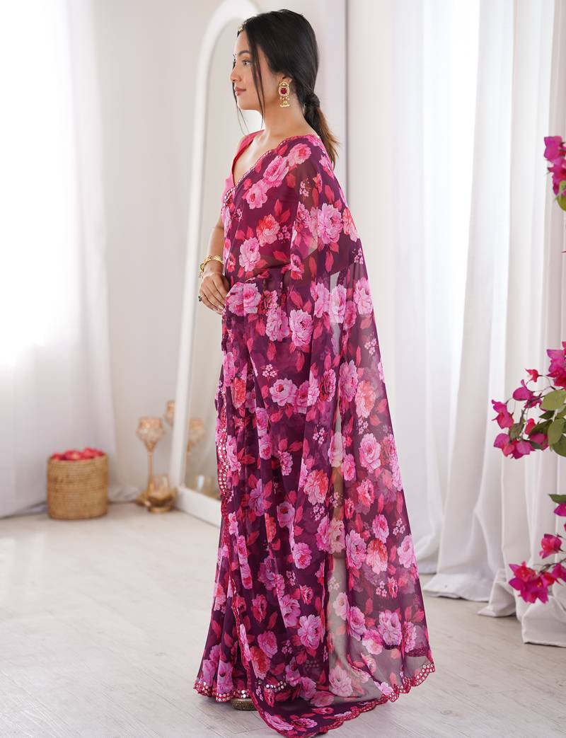 | Product Name | Heavy Georgette Floral Mini Flower Print Saree With Mirror Work & Cutwork Border | |