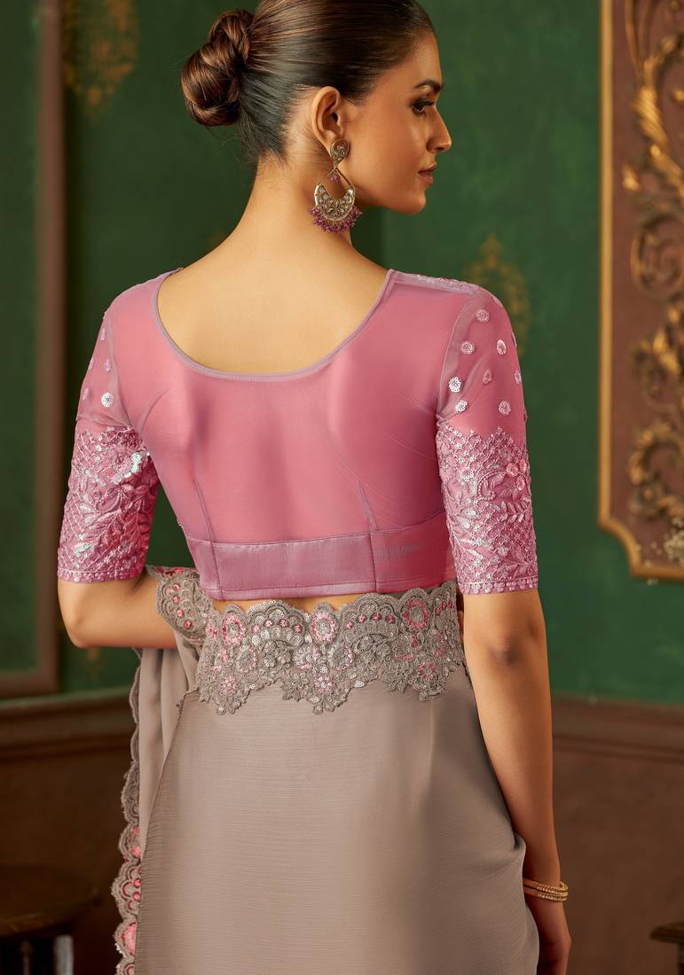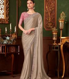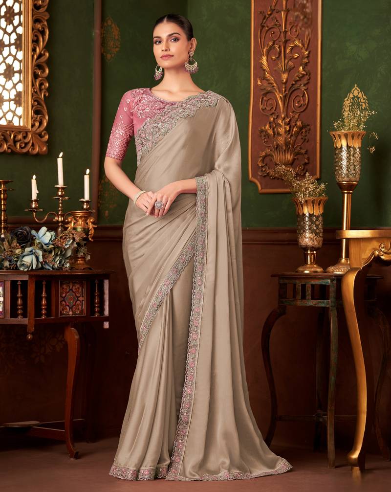 Light brown heavy chiffon silk blend saree with embroidery with unstitched blouse