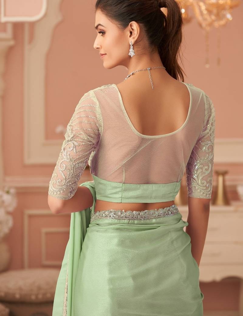 Light green rainbow chiffon silk with embroidery & banglori silk unstitched blouse – designer saree for festive wear