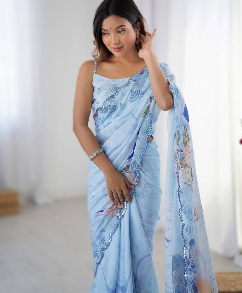 Light sky blue heavy chinon printed saree with pape mirror work & mirror border | designer party & wedding wear saree