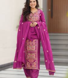 Magenta readymade chinnon silk embroidered kurta pant dupatta set stitched