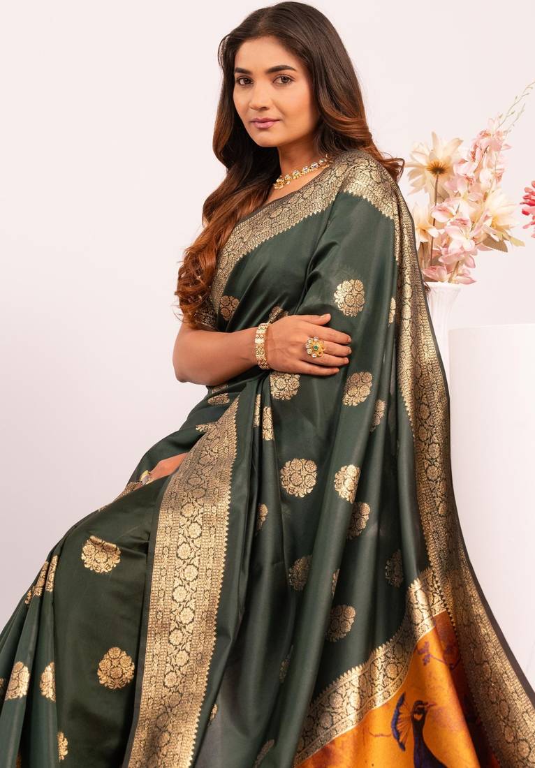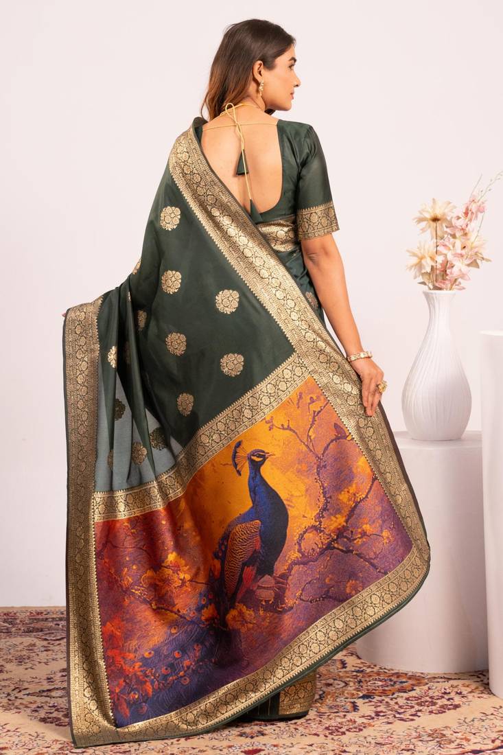 Mehendi extraordinary banarasi silk saree with resham weave peacock pallu & zari border