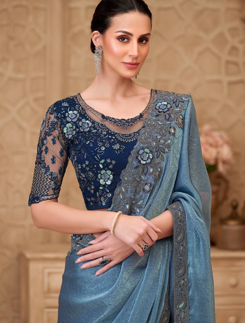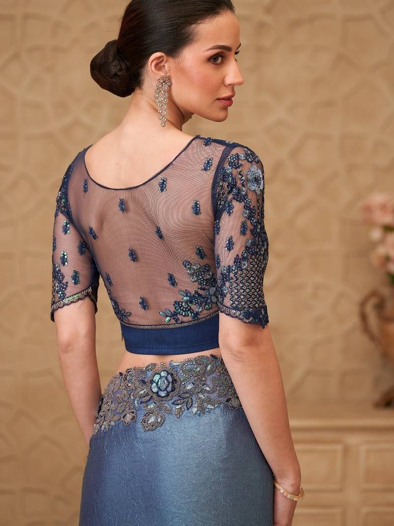 Product Name | Metal Blue Satin Crush Georgette Saree With Tussar Silk Blouse | |