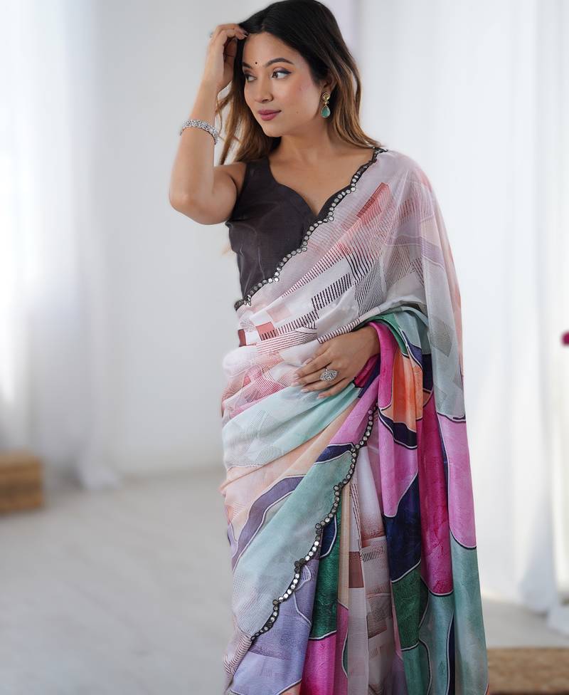 Multicolor heavy chinon printed saree with pape mirror work & mirror border | designer party & wedding wear saree