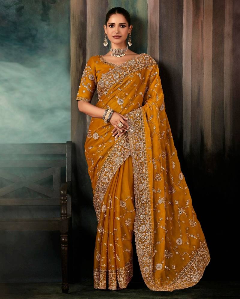 Mustard luxury bridal saree for wedding | fancy fabric saree with hand embroidery & designer blouse