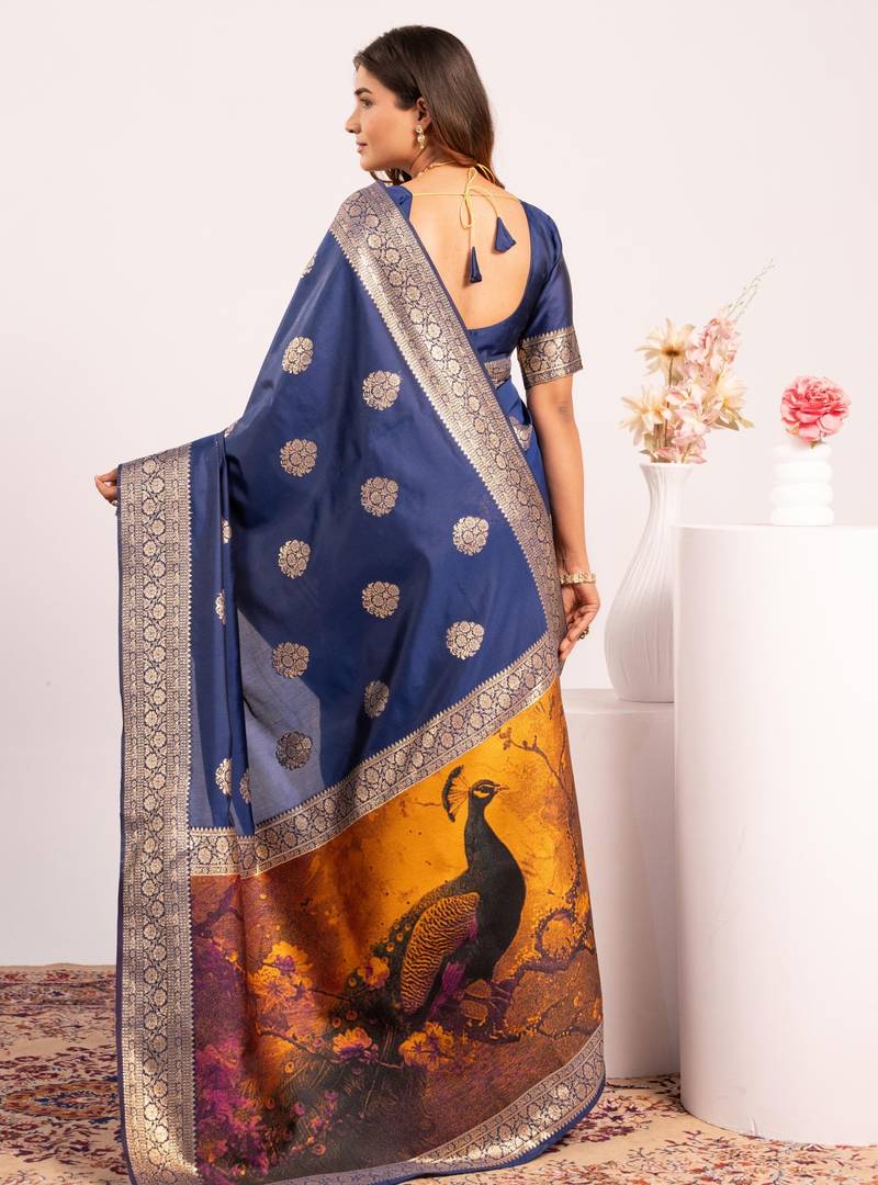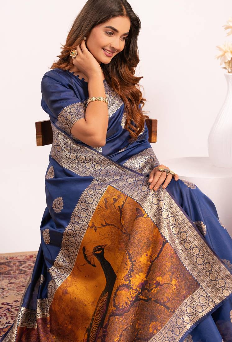 | Product Name | Navy Blue Extraordinary Banarasi Silk Saree With Resham Weave Peacock Pallu & Zari Border | |