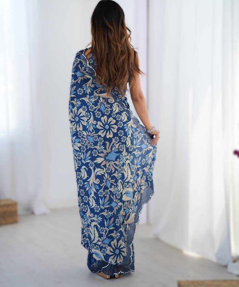Navy blue heavy chinon printed saree with pape mirror work & mirror border | designer party & wedding wear saree