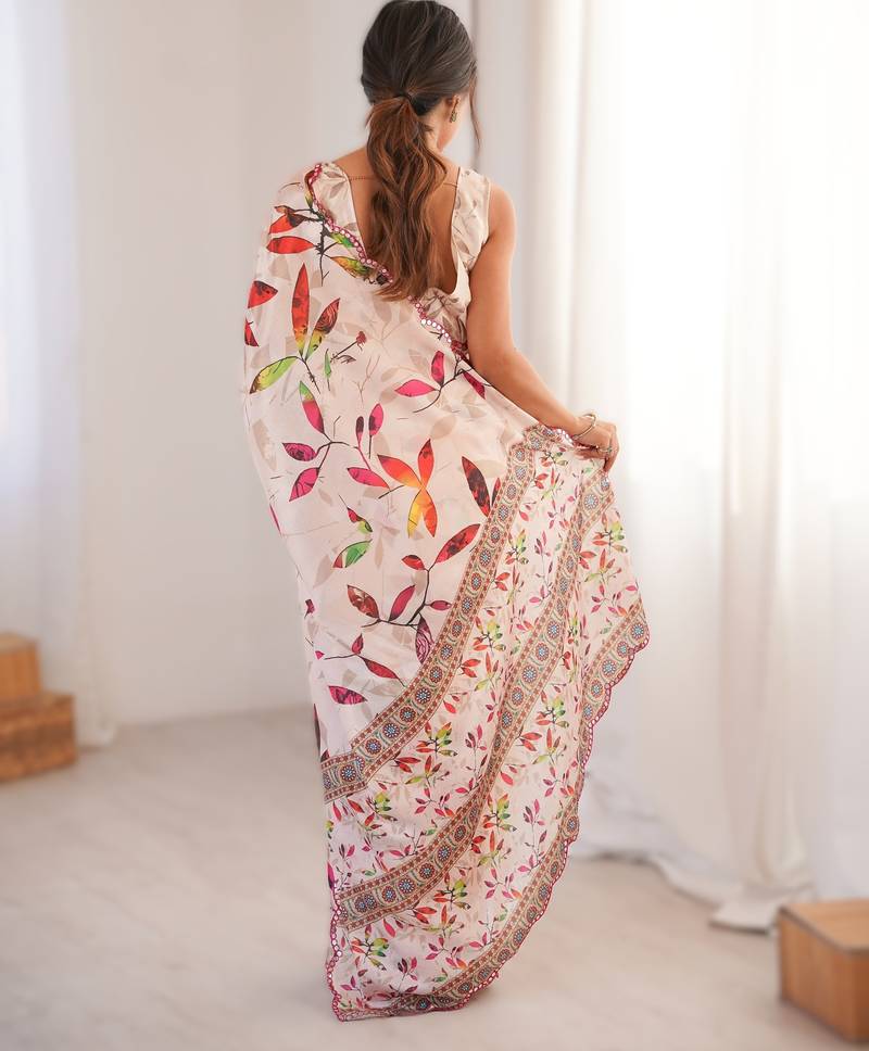 | Product Name | Off White Heavy Chinon Printed Saree With Mirror Work Border | |