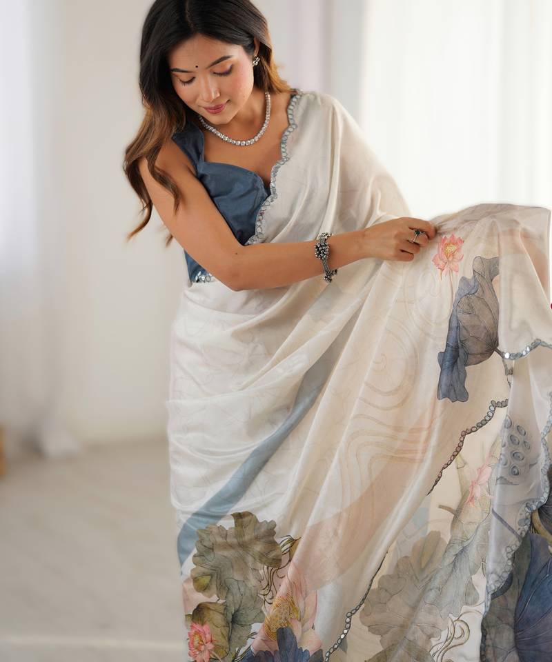 Off white heavy chinon printed saree with pape mirror work & mirror border | designer party & wedding wear saree