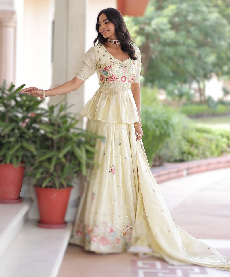 | Product Description | Off White Silk Lehenga Set With Sequins & Zari Embroidery Crafted For Traditional Occasions And Celebrations. This Off White Lehenga Features Detailed Gold Crush Sequins And Zari Embroidery Across The Skirt And Choli, Paired With A Matching Dupatta That Complements The Rich Work. The Readymade Ensemble Blends Texture And Shimmer In A Classic Silhouette, Making It Easy To Style With Ethnic Jewelry And Heels. Ideal For Weddings, Festivals, And Cultural Gatherings, This Set Brings Together Light Colored Fabric And Intricate Metallic Embroidery For A Cohesive Dressed Up Look. |