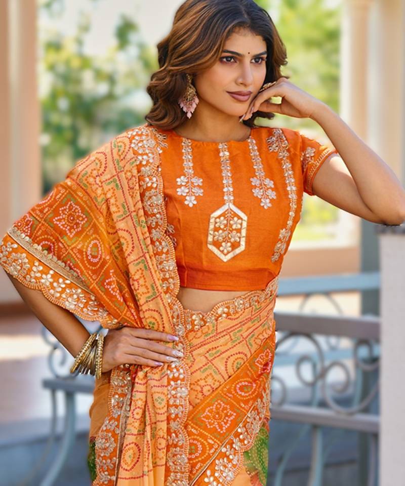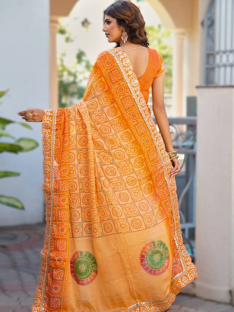 orange fancy print bandhani saree heavy moss chiffon with heavy work blouse