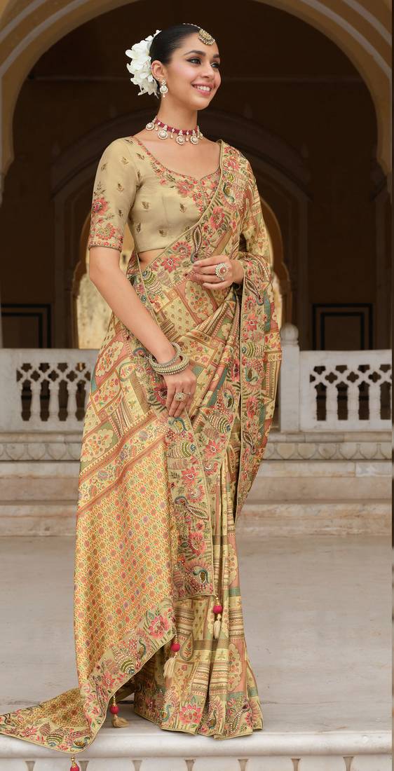 | • | Saree | : | Color- Golden / Fabric- Silk Blend |