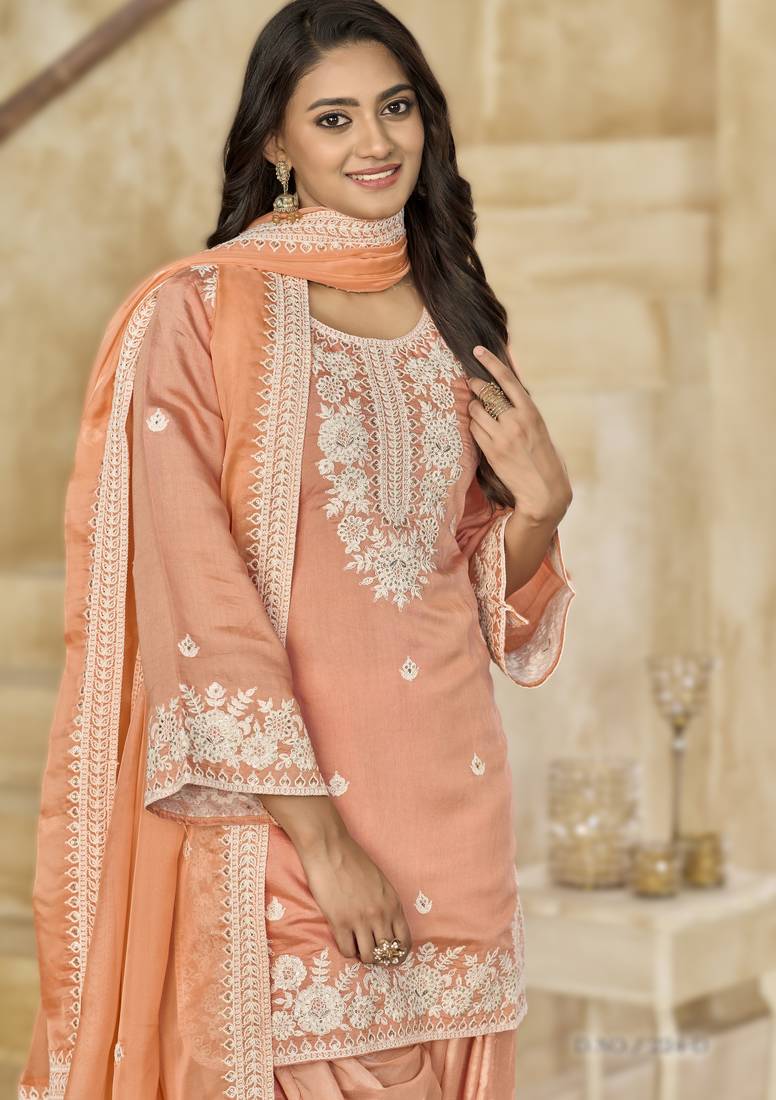 | Product Name | Peach Elegant Pv Chanderi Roman Silk Ready Made Suit With Organza Dupatta | |